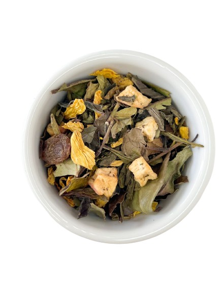 Blend de Chá branco Pai Mu Dan da China com pêssegos, uva, maçã e brotos de girassol.